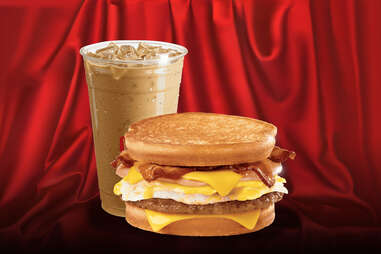 The headliner menu item is the Breakfast Baconator, a big, breakfast-y twist on the regular menu staple. It's like a burger crossed with brunch crossed with your friend daring you to try to finish it before 8 am. Wendy's stacks them with sausage, two layers of bacon and cheese, a fried egg, and some hollandaise-Swiss cheese sauce for good measure. It's... a lot. It might be a tad too hefty to eat with one hand in the car, but its size is by no means a con here. You're gonna be full. And depending on what you did the night before, you might feel less hungover afterward.